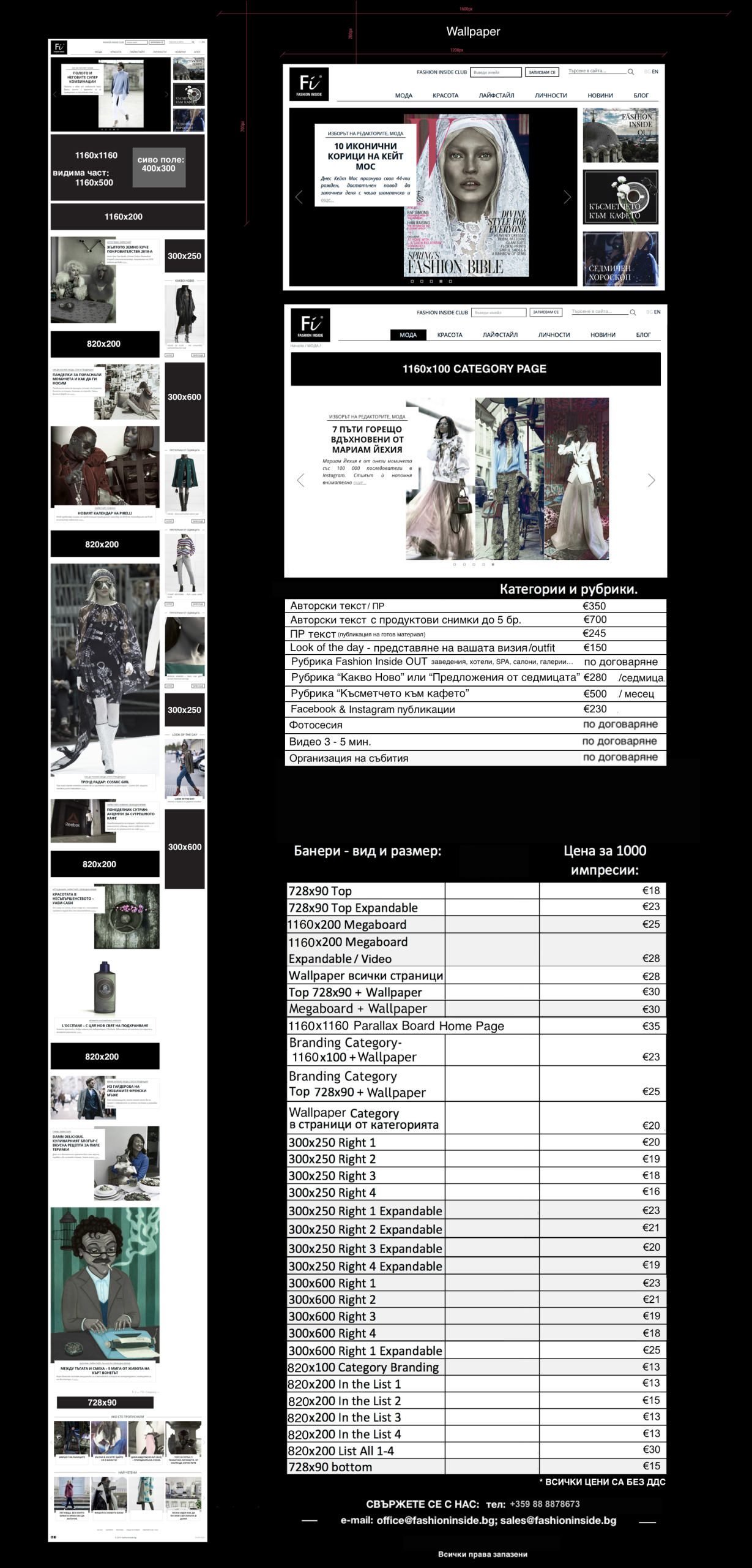 Във Fashion Inside, ние предлагаме широка гама от маркетингови решения за компаниите, които са заинтересовани да достигнат до нашата влиятелна и силно ангажирана аудитория. Работим в тясно сътрудничество с нашите рекламни партньори и клиенти, за да постигнем целите на марките и кампаниите им. Проследяваме и обновяваме всички детайли по имиджа, съдържанието и рекламните формати на медията в съотвествие с желанието и търсенето на аудиторията и клиентите си.