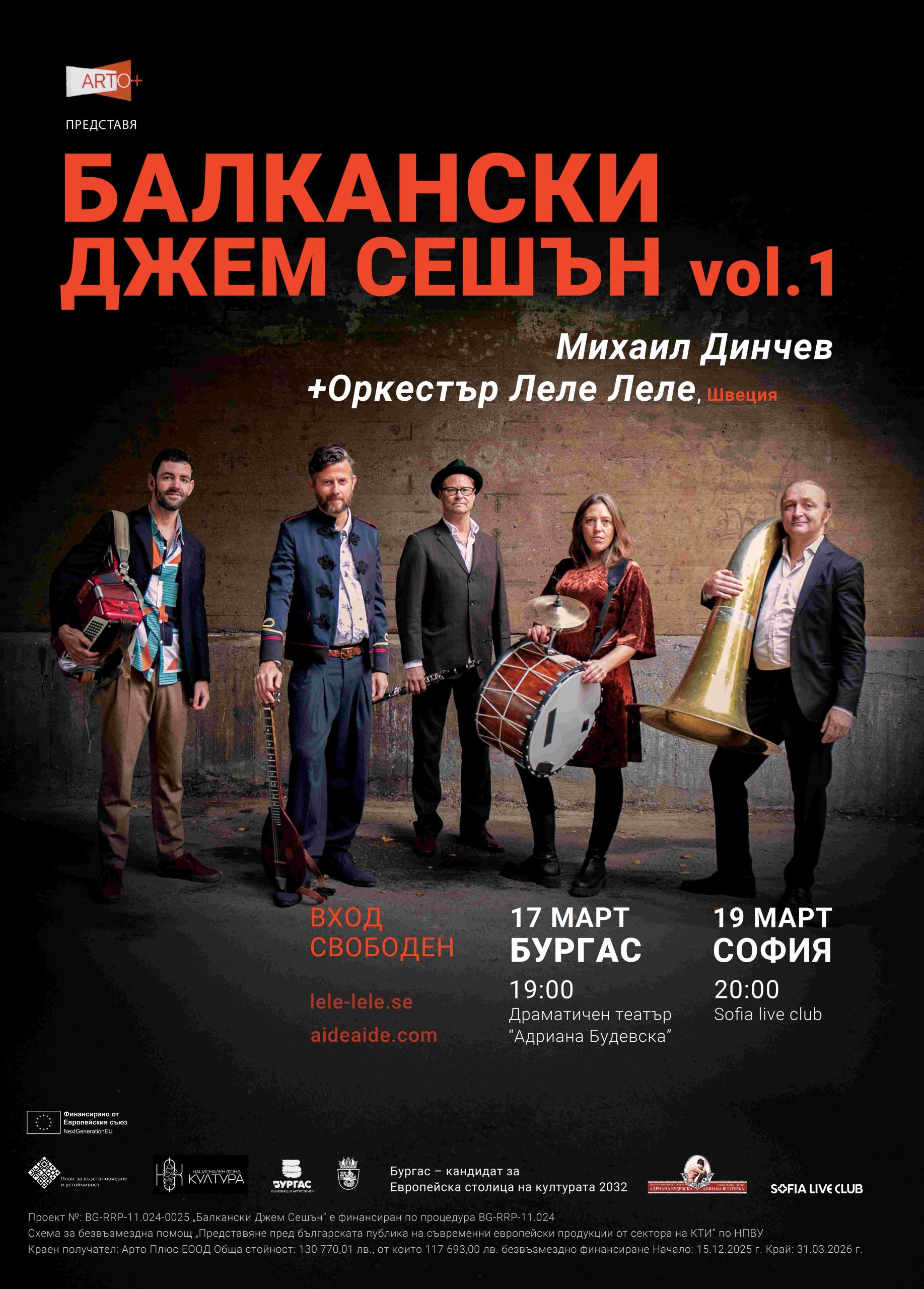 Оркестър „Леле Леле“ от Стокхолм пристига у нас за концерти в Бургас и София. В морския град ще бъде на 17 март в Драматичен театър „Адриана Будевска“ от 19 часа, а в столицата два дни по-късно – на 19 март, в Sofiа Live club, от 20 часа. Те ще представят най-новото си музикално шоу, което е част от първото издание на „Балкански джем сешън“, а концертите са със свободен вход до изчерпване на местата.