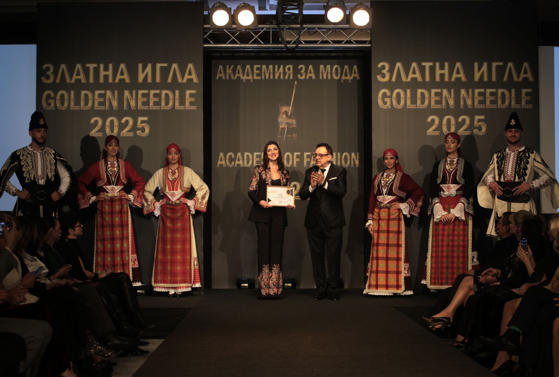 Дизайнери и модни къщи представиха най-новите си предложения по време на Годишните награди „Златна игла 2025“. Соня Бозова – търговският директор на бранда Bulgarche by Bozov Style, откри гала спектакъла на Академията за мода, като презентира четири дамски носии – еднакви по линия, различни по дух, всяка с уникален цвят, настроение и женска вселена, както и две мъжки – братя по стил, различни по цветова енергия. Те са символ на българската мъжественост, на дух и корен. Соня Бозова получи грамота на Академията за мода „За популяризиране на народната носия“.