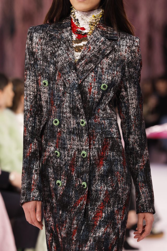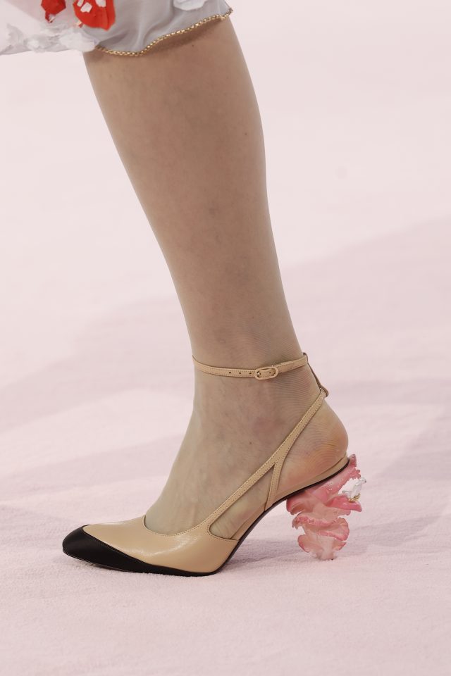 Мотиви с пера бяха загатнати по множество начини – от бродерия до тъкане. Дори класическият костюм на Chanel получи нов прочит. И всяка дреха отразяваше усета на Блази за създаване на сложност и движение, заедно с отличното му чувство за цвят. Където и да погледнеш, имаше още съблазнителни, деликатни детайли – от емайлирани магически горски създания за копчета до гъби за токове на обувки. А тъй като птиците бяха основният мотив – птици от всякакъв вид бяха закачени по таблата в студиото на Chanel – пера присъстваха както реално, така и в стилизирана форма.