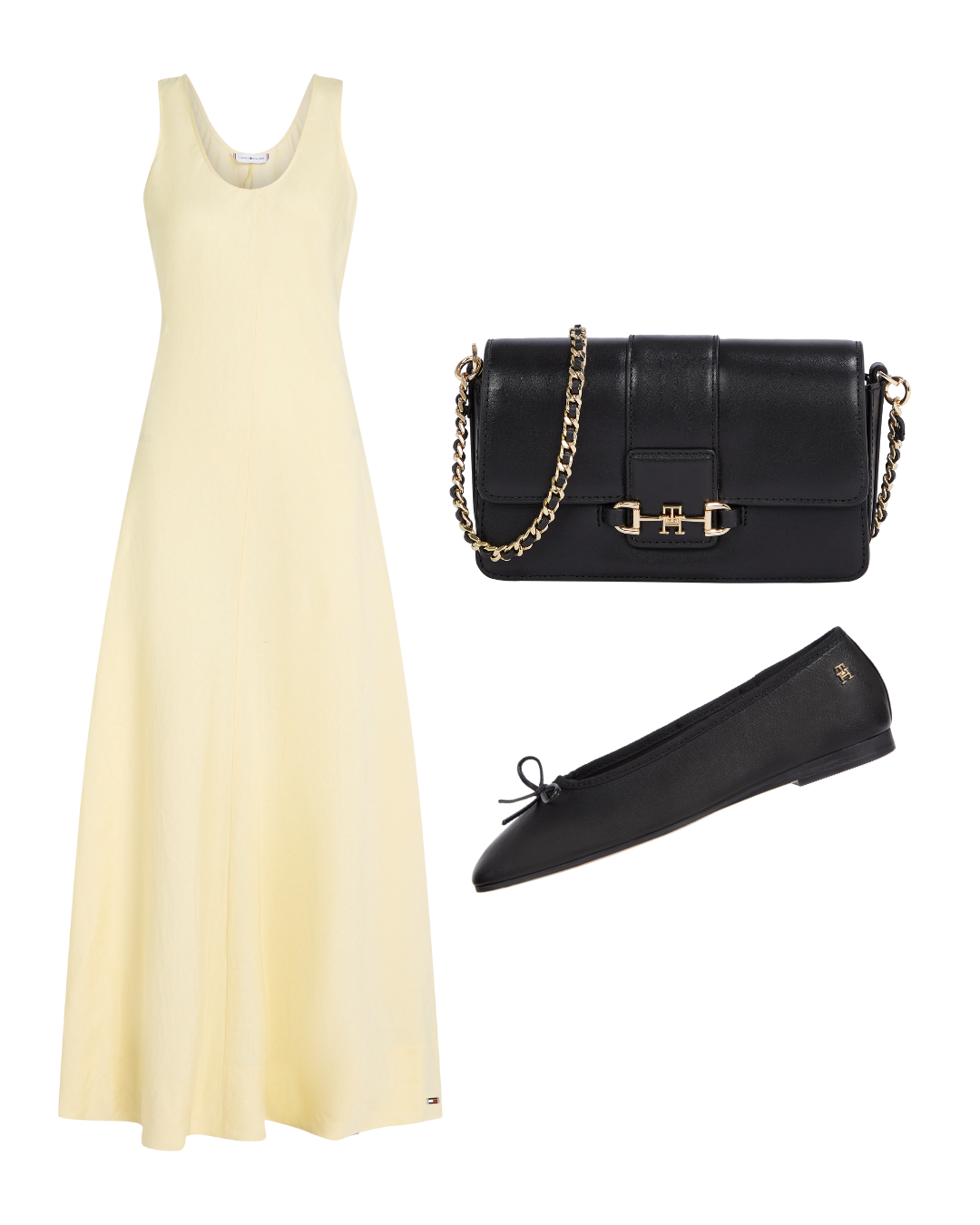 Най-изпитаната формула за добър летен стайлинг: макси рокля + класически аксесоари. Действително няма къде да сгрешите. В нашия случай роклята е в мек масленожълт нюанс, а аксесоарите са кокетни балеринки с панделка, съчетани с класическа чанта през рамо със златни детайли.
