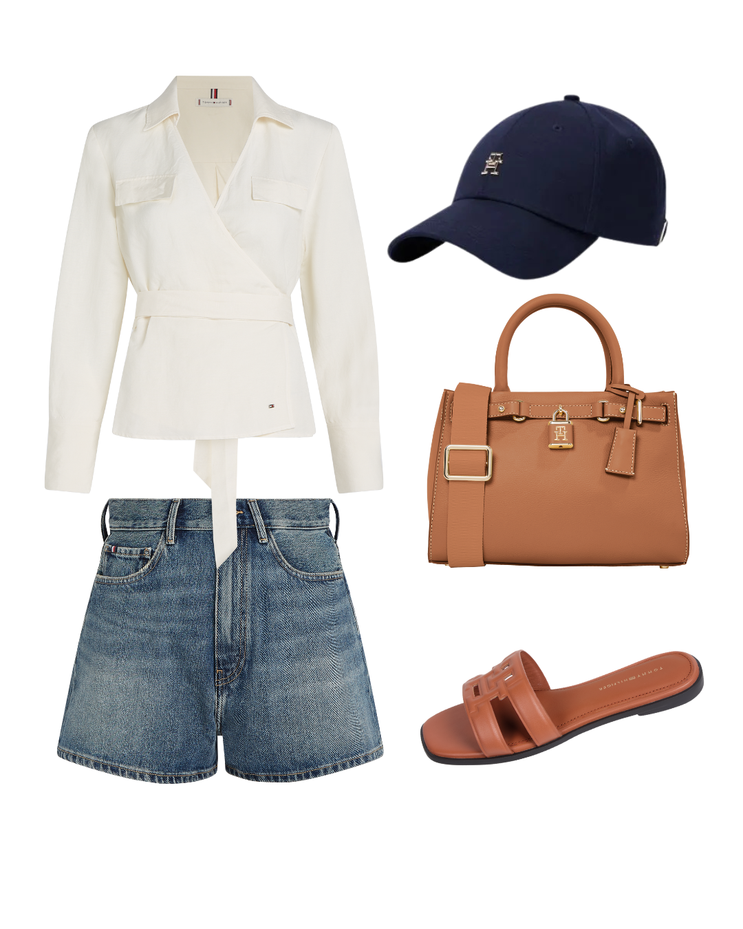 Структурирана риза тип прегърни ме с яка и изразени рамене + елегантна дамска чанта, комбинирани с по-ежедневни елементи като класически дънкови шорти, чехли и шапка с козирка. Резултатът: актуална model-off-duty визия.