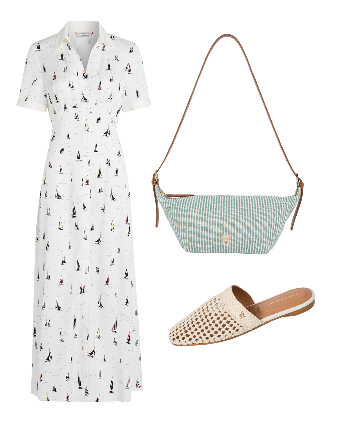 Не можем да комбинираме много слоеве, но кой е казал, че не можем да комбинираме много текстури и принтове? Особено когато всички са иконични за лятото и изпълнени с Tommy чар. Дълга рокля тип риза с принт на ветроходни лодки, дамска чанта на бяло-синьо вертикално райе с детайли от кожа и плетени чехли. Безгрижен аутфит за безгрижните дни.