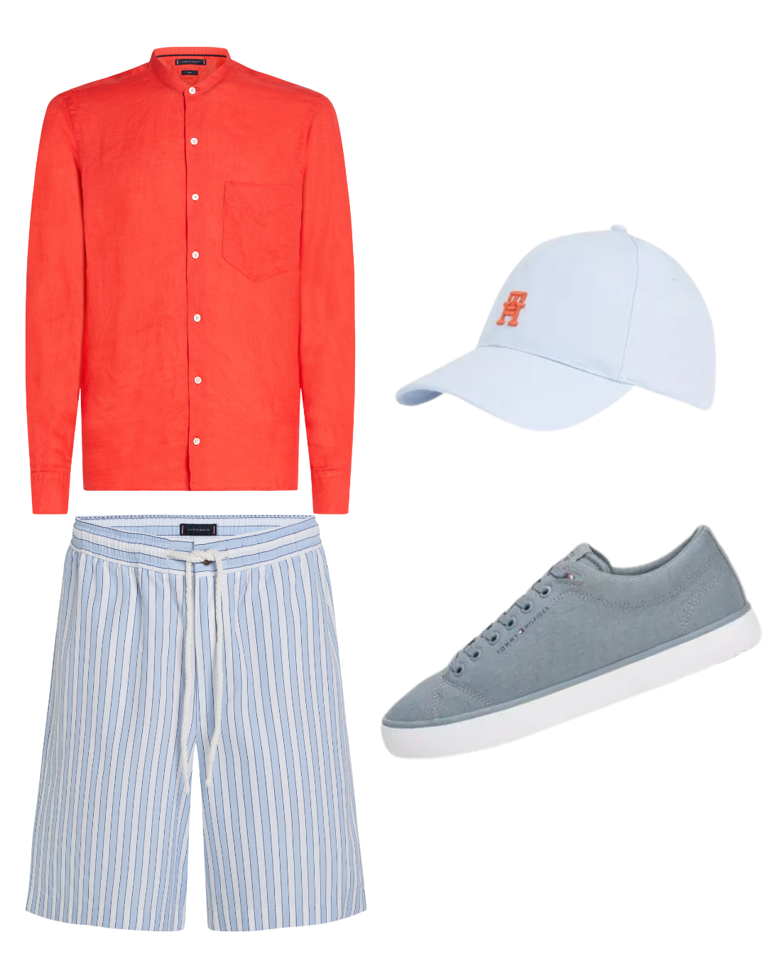 Лятото е най-подходящият сезон, в който да разиграете всички ярки цветове от гардероба. Ленената риза е един от най-привлекателните елементи в мъжката селекция на Tommy Hilfiger за този сезон. За да балансирате яркия ѝ цвят, може да съчетаете с по-обрани елементи като шорти и кецове в светлосиньо + шапка с козирка, вкарваща малко и от двата цвята. Младежки и непринуден аутфит, олицетворяващ летния vibe.