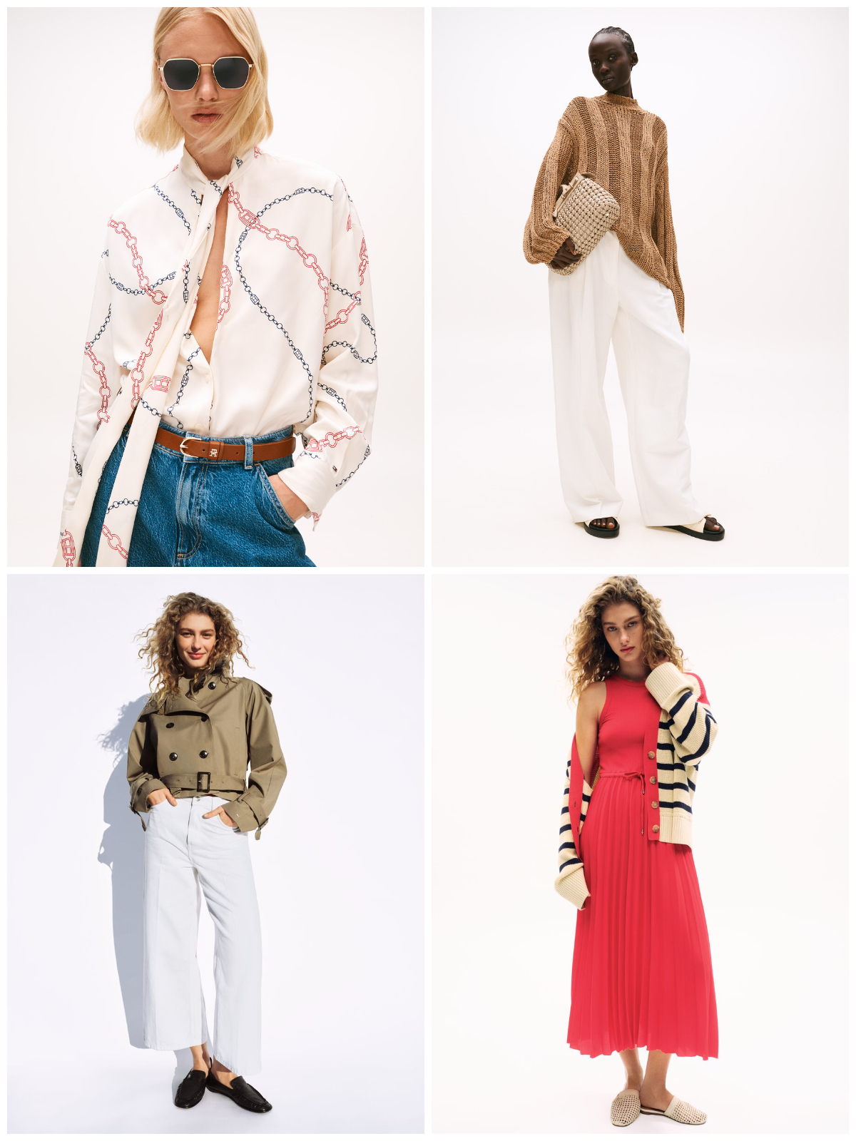 Дамската колекция представлява фина смесица от уют и лекота – преходни връхни дрехи, текстурирани плетива и нови, раздвижени дънкови силуети, без да пропускаме панталоните в бяло. Лененият блейзър се завръща в камел, нежно райе или бяло, като чисто платно, готово за нови приключения. Тренчът също е тук – в дълъг и в къс вариант, както и якета.