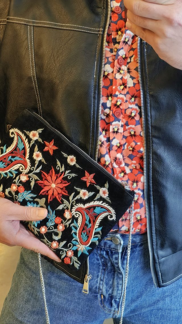 НЕДЕЛЯ – пореден ден до града, този път за кино. Грабвам един велурен клъч, отново с флорална бродерия. Решавам, че се възползвам от всички цветове в него. За това – червена риза на теменужки. Семпли сини дънки. Обувки с груба подметка и червен акцент. И отново коженото яке с бели шевове. Au revoir, огледало, че да хвана прожекцията навреме.
