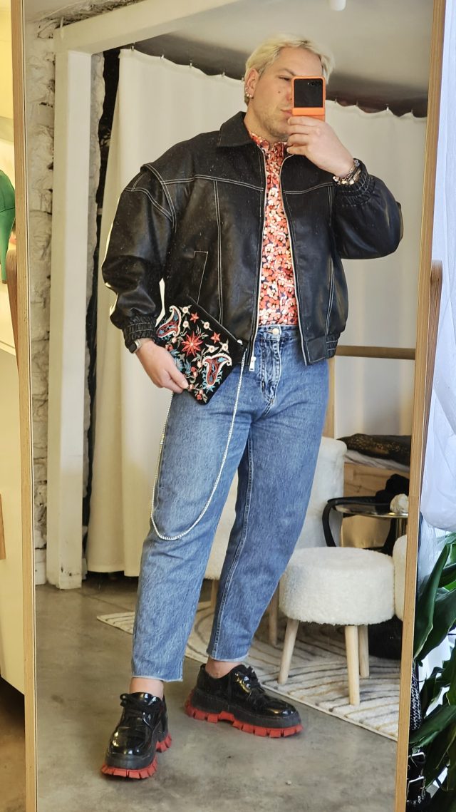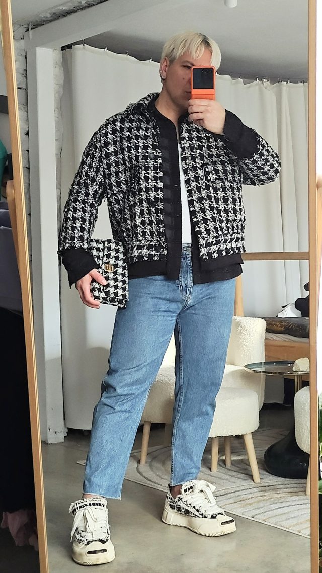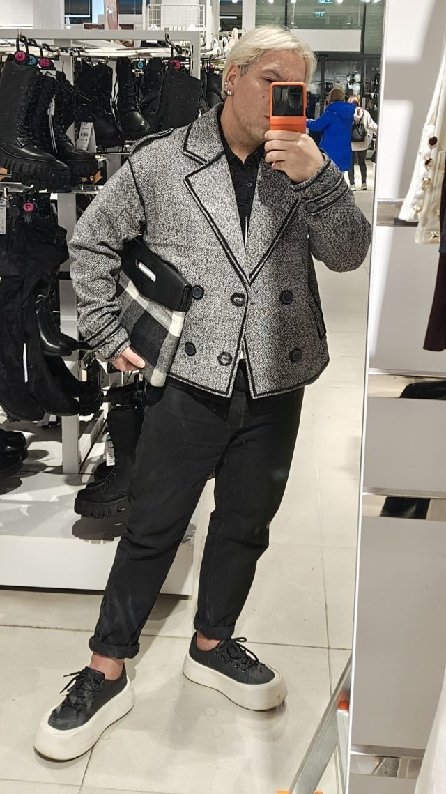 СРЯДА – лудницата е пълна и съм на бегом от сутринта. Тотално забравил да се снимам сутринта, сещам се в 19.25ч и влизам в един магазин бързо да поправя тази грешка. ЛЮБИМ аутфит с овърсайз вълнен клъч и ръчно рисувано яке, което да допълва стилово.