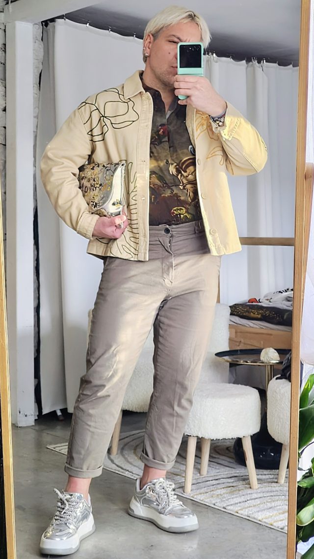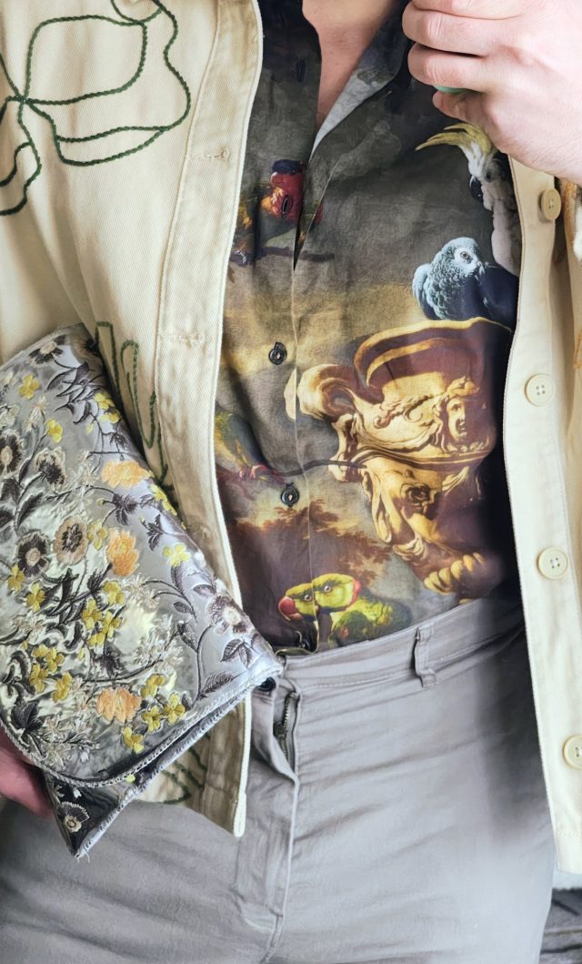 ПЕТЪК – насъбрал кураж от предния ден, решавам днес да се спра на един винтидж клъч в метални отблясъци флорална бродерия. Подсилвам огледалните му черти, като добавям и такива маратонки. Ще разсея от тях, като заложа на риза в ренесансов принт на папагали и колони. За да не прекаля съвсем, избирам бледо зелен панталон, същия нюанс като от бродерията. Щрак и сме готови да гоним задачите по града.