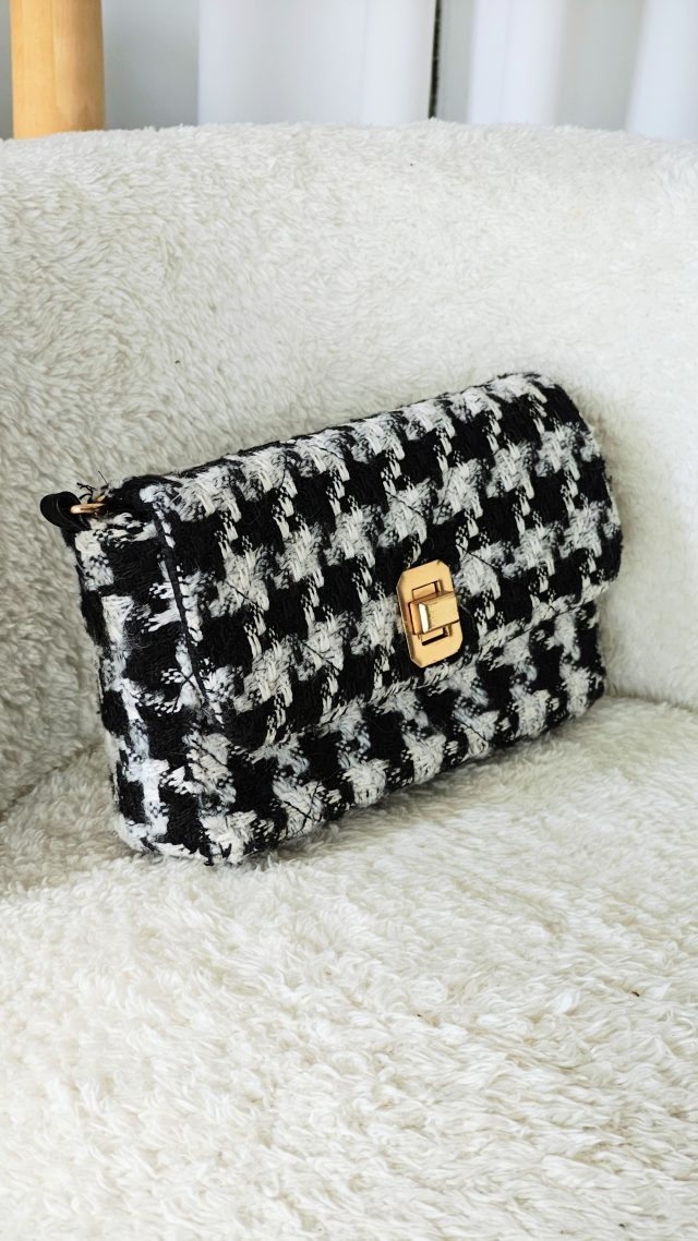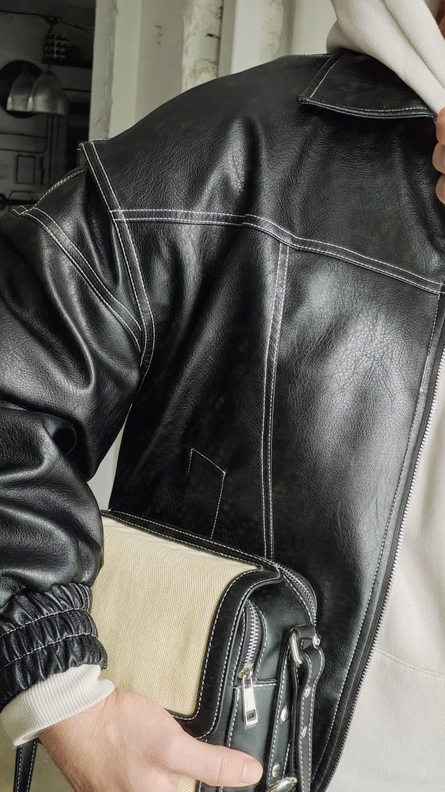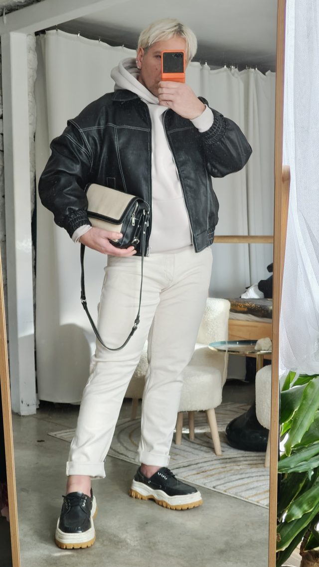 ВТОРНИК – решавам предизвикателството да е с една позабравена от мен чанта. В черна кожа и контрастни бели шевове, досущ като на якето. Тук ще е лесно – правя АУТФИТ В ДВА ЦВЯТА и приключвам задачата за минута.