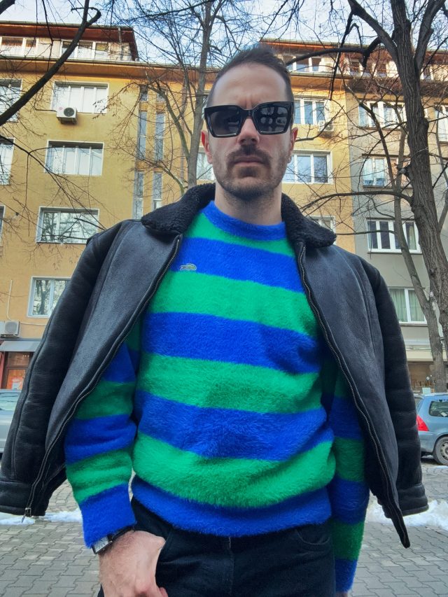 Времето навън беше адски студено и сиво и затова сложих пуловер на Lacoste, който пак е на Александър, но подарък от мен за него. Много е уютен, мек и топъл. Комбинирах го с тъмносини дънки и shearling кожено яке, отново second hand, този път от How To Babushka.