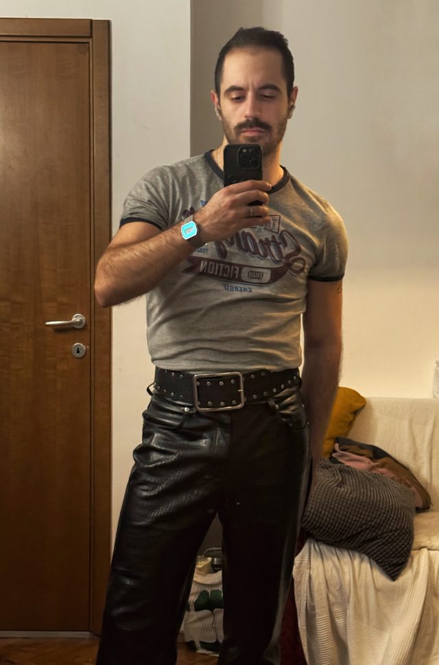 Имаме винтидж тениска с принт, комбинирана с кожен панталон H&M и кожен колан, който остана от костюмите за последния театрален спектакъл, който режисирах, с костюмограф Еда от The Trackers.