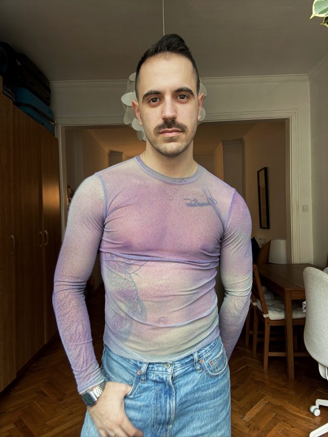 Облякох тази блуза за кинопрожекция на последните ми куиър филми в Пловдив заедно с Фондация „Поглед“ и Фондация „ГЛАС“. Когато представям куиър проекти, обичам да се обличам малко по-цветно, за да пресъздам настроението на събитието и съм голям фен на всякакви мрежести топове, с което се шегуват всички мои приятели.