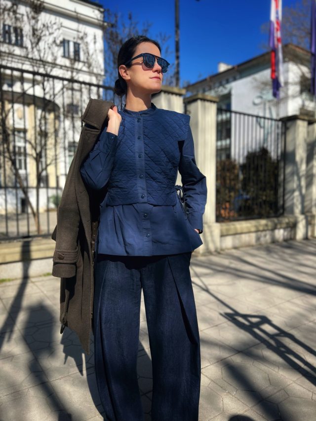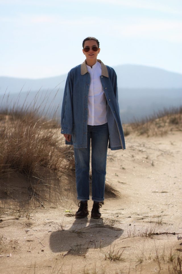 Екскурзия до морето – за кратко да послушам вълните и после обратно в града за кафе. За днешния ден избрах удобна комбинация с дънки. Якето има специално значение за мен – принадлежало е на баба ми и винаги го нося с много гордост.