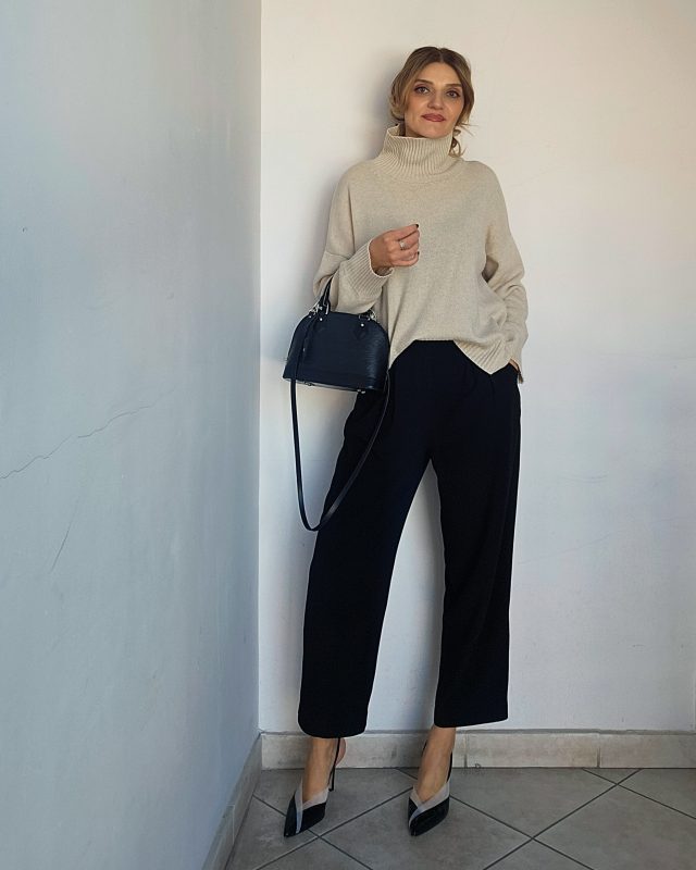 Всичко без чантата е на български марки и дизайнери: пуловер Amaya Ros, панталон Sassa Björg, обувки Atana, чанта LV.