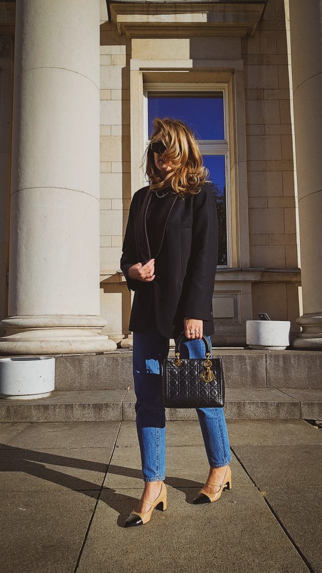Блейзър Sandro, обувки Högl, чанта винтидж Lady Dior, дънки Levi’s 501 mom fit.