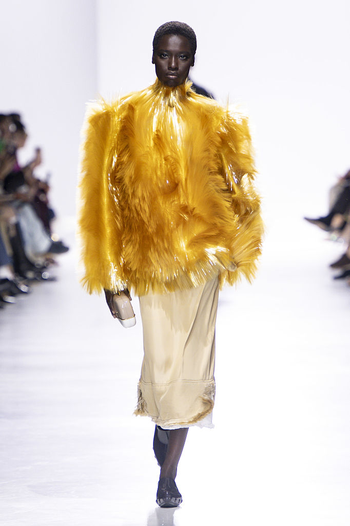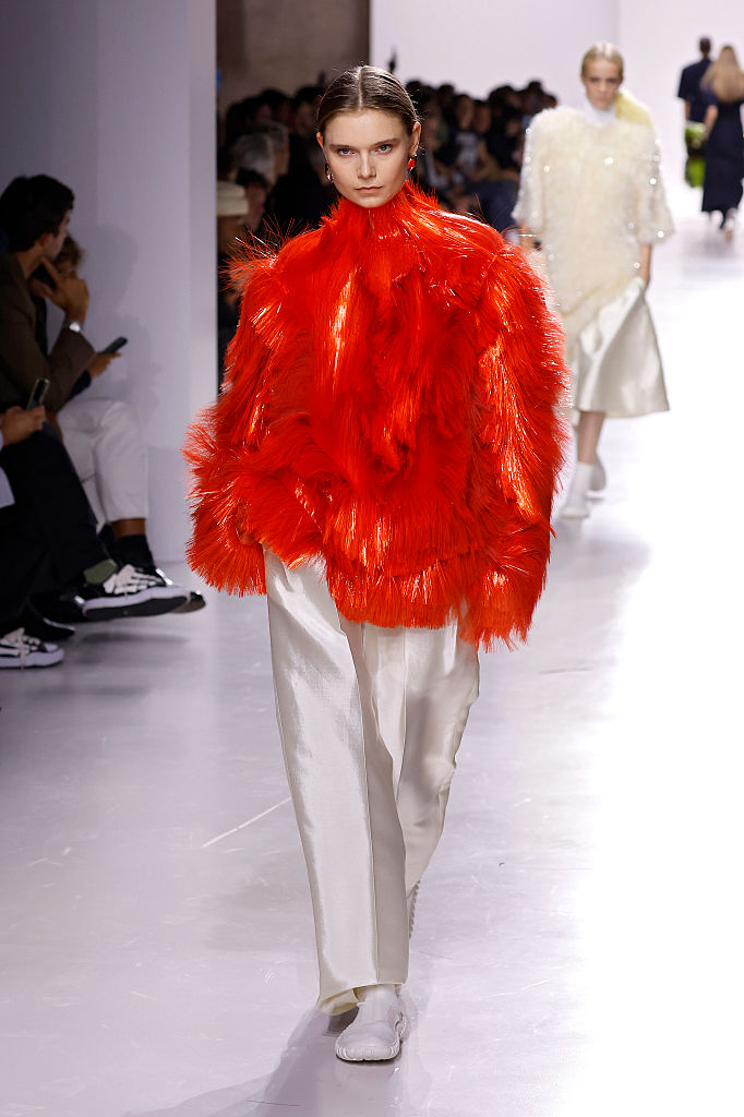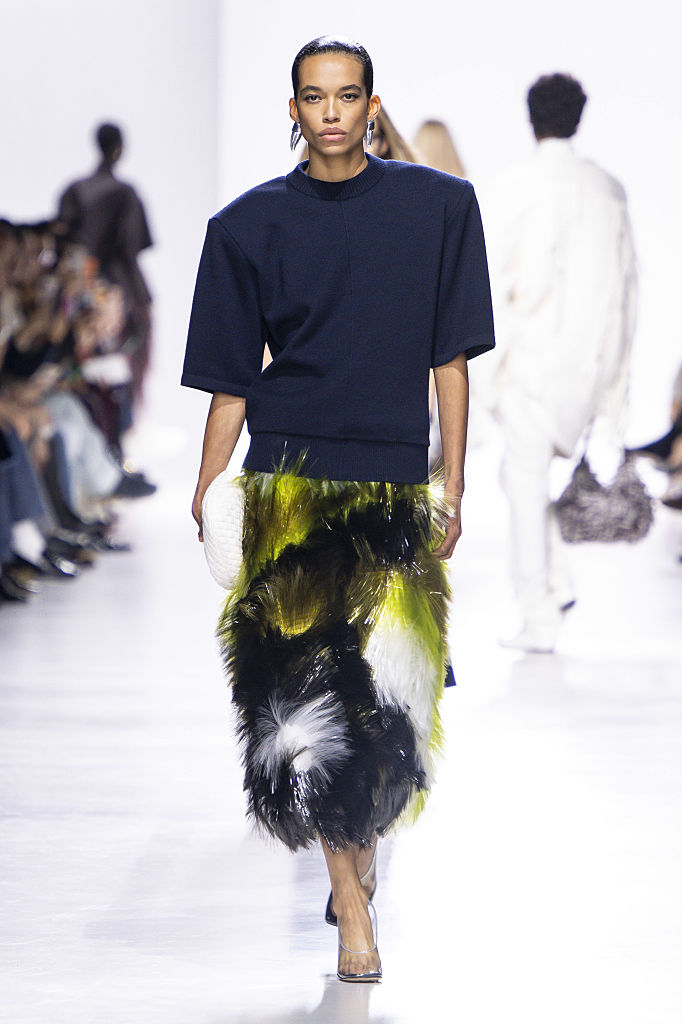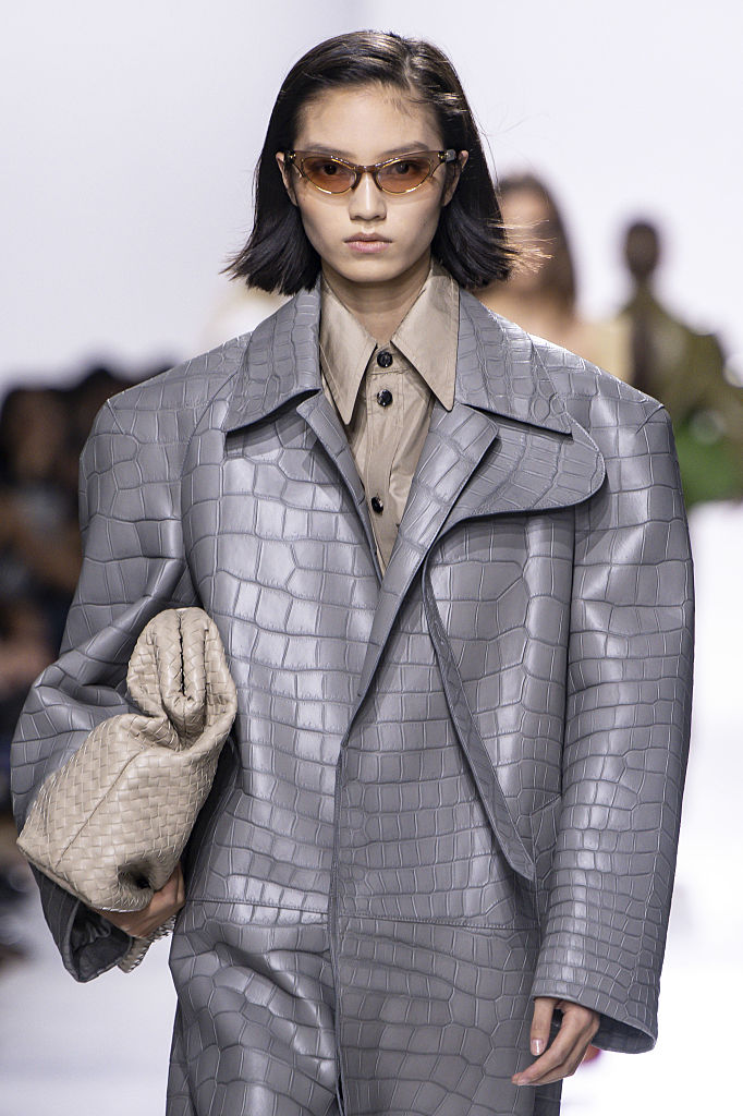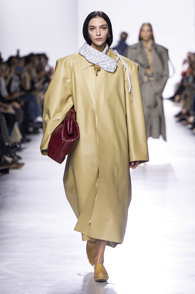 Безброй интерпретации на иконичните Bottega чанти, oversize палта и любимите на модните редактори обувки тип сабо с остър връх… Колекцията ставаше все по- тактилна с всяка следваща визия: кожени ризи с копчета бяха съчетани с пищни поли от пера в комбинации от светлосиньо, лайм, бордо, сребристо и черно. Рокли, набрани и скулптирани по тялото. Пуловери с подплънки на раменете и квадратно изрязани силуети с отчетливо усещане за 80-те, макар че в случая не бе запазена нито следа от изконната им кичозност.