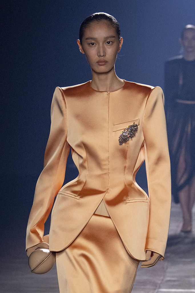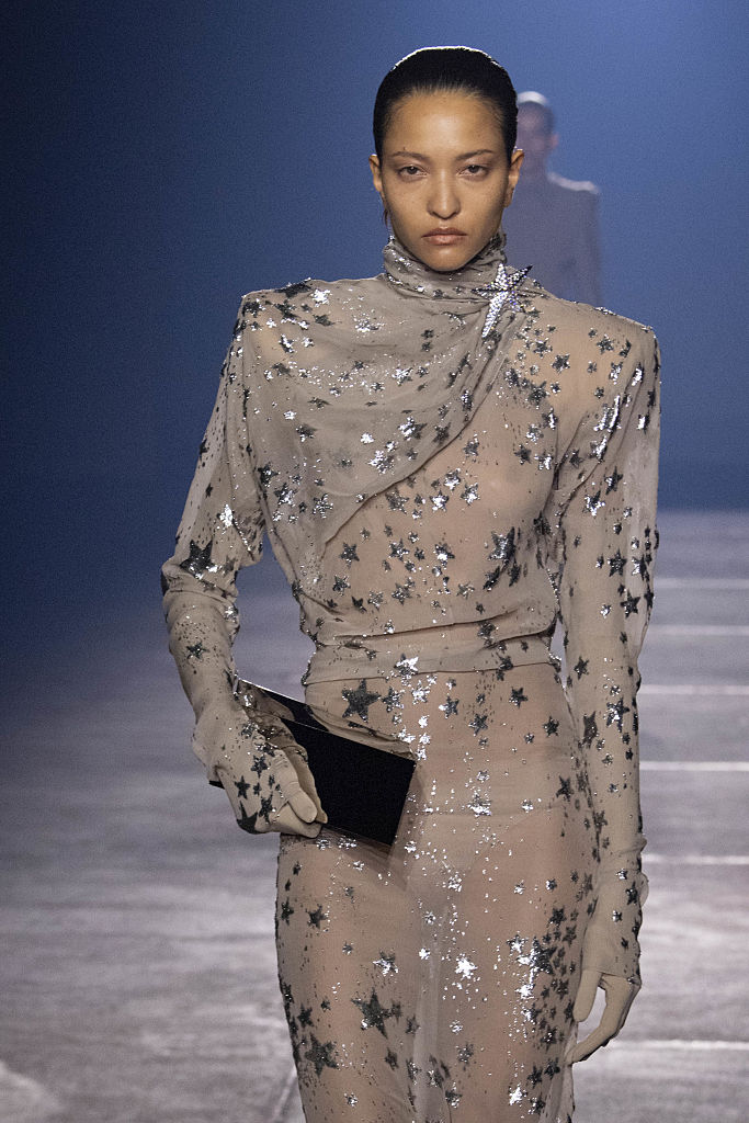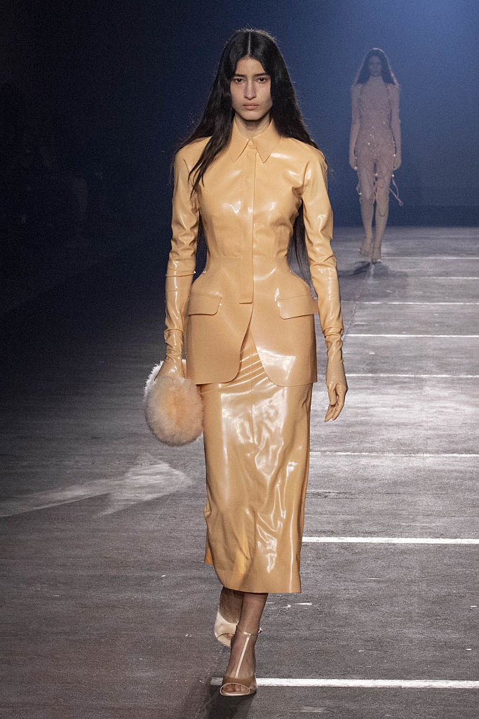 Минималистични костюми от прилепнали по тялото бодита и поли, експлодиращи от пера, или драпирани в mid-century маниер; максимално вталени палта и рокли от кожа; деколте off-the-shoulder – всичко това, представено в подземен парижки гараж.