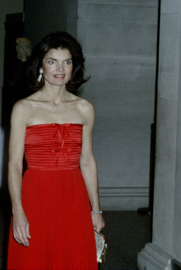 На сватбата си с Аристотел О’Насис през 1968 година, Джаки носи бяла дантелена рокля Valentino. По-късно тази рокля се превръща в най-имитирания котюр тоалет на всички времена. Истината е, че тя е обичала марката Valentino през целия си живот, а в деня на смъртта ѝ самият Валентино е отдал лични почести на Джаки.