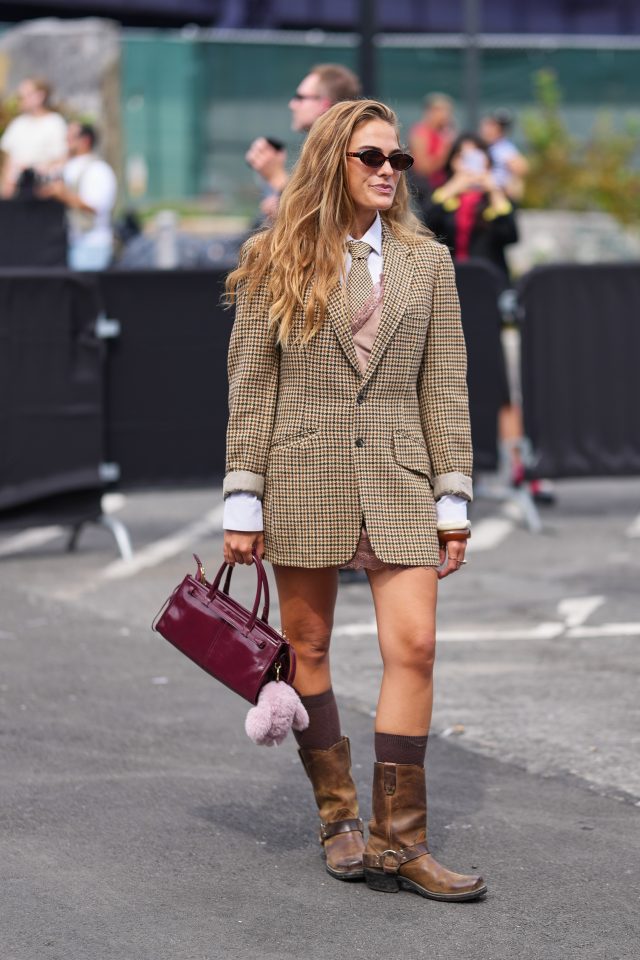 Ако каретата не са ви по вкуса, заменете тартана с елементи, вдъхновени от ездата — класически тъмносин блейзър или ботуши за езда, които могат да внесат баланс към по-буквалната празнична визия. Не всичко е клишета.