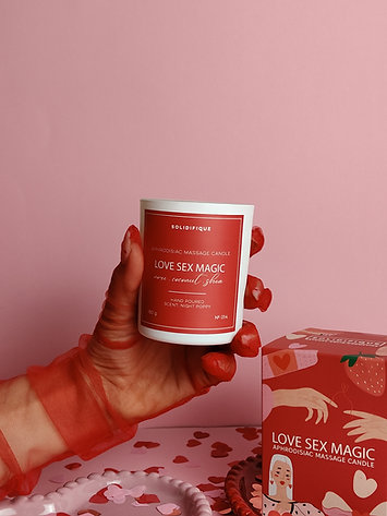 Масажната свещ с афродизиак на Solidifique е лимитирано издание за Свети Валентин, създадено да превърне докосването в интимен ритуал за близост и сетивност. Съдържа натурален екстракт от Нори – фин афродизиак, който стимулира сетивата, създава усещане за топлина и подпомага отпускането на тялото и ума. Свещта се разтапя при ниска температура и се превръща в копринено, нежно масло, подходящо за масаж на цялото тяло. Формулата хидратира и подхранва кожата, оставяйки я мека, гладка и деликатно ароматна. Ароматът е чувствен и балансиран, създаден да подчертае интимната атмосфера, без да натежава.