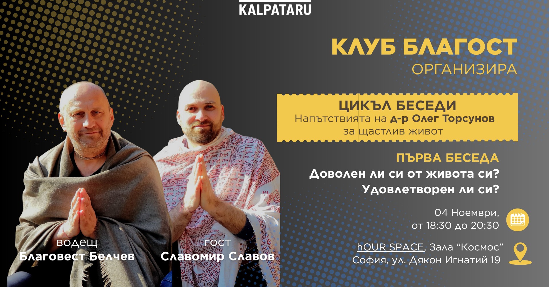 Събитието ще бъде водено от Благовест Белчев, основател на Клуб „Благост“, който ще въведе темата чрез представяне на личността и учението на д-р Олег Торсунов и книги като „Ведическата концепция за щастлив живот“ и „Законите на щастливия живот“.
