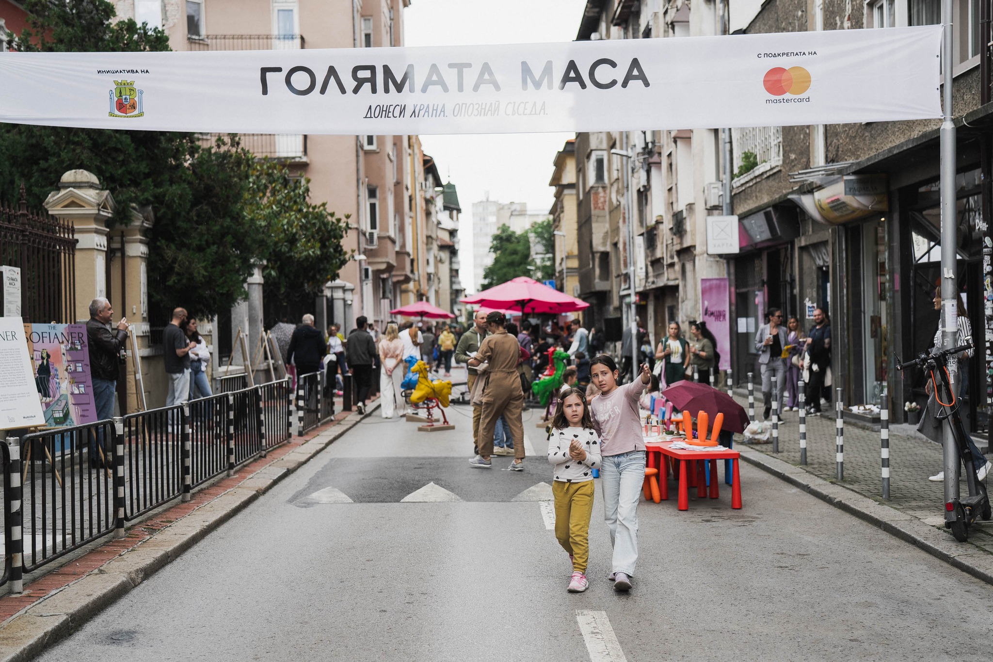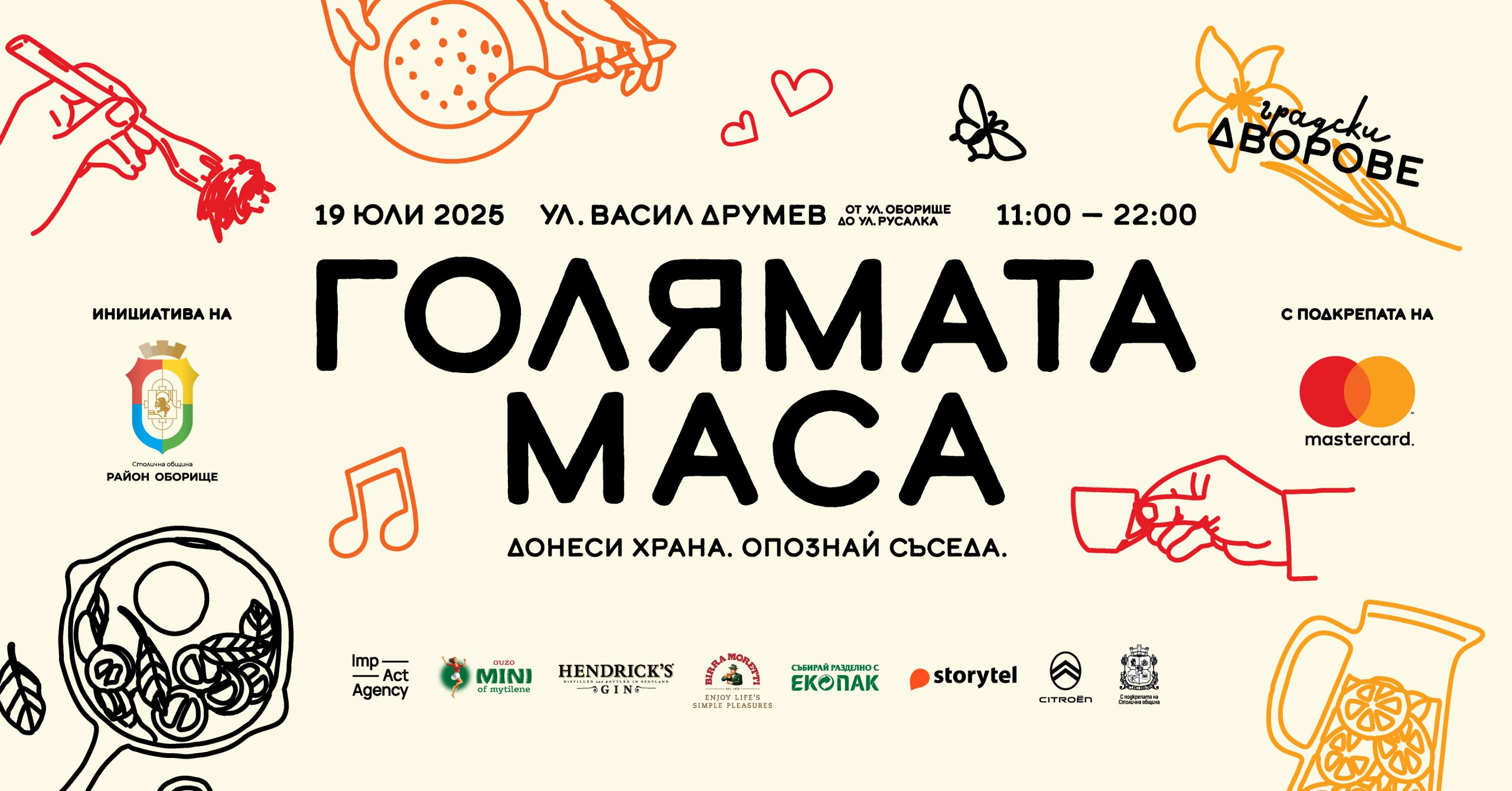 Тази събота, на 19 юли, ГОЛЯМАТА МАСА на район “Оборище” кани всички на една различна и нова локация – ул. “Васил Друмев”, в отсечката от ул. “Оборище” и ул. “Русалка”. Акцент във второто издание на инициативата за 2025 г. са красивите софийски дворове, смисълът да поддържаме споделените градски пространства приветливи и чисти, и начините да ги използваме заедно като общност. Затова организатори готвят безплатни работилници за озеленяване и отговорно събиране на отпадъците, и гаражна разпродажба на стари вещи и дрехи с грижа за природата. Както обичайно, са планирани и музикални изпълнения, срещи с артисти, изложби и детски творчески работилници като част от програмата на “ГОЛЯМАТА МАСА: Градски дворове” между 11:00 и 22:00 ч. По традиция инициативата призовава “Донеси храна. Опознай съседа.” или подкрепи малък бизнес. A всяка покупка на храни и напитки с Mastercard карта от павилион на място носи на госта 10% обратно по сметката му с програмата Mastercard Ден.